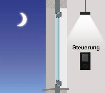 An einem heißen Sommertag muss die Sonne weitgehend ausgesperrt werden, damit das Gebäude angenehm kühl bleibt. Der außenliegende Sonnenschutz reduziert den Lichteinfall und lässt ein blendfreies Arbeiten zu. Bei besonderen Anforderungen kann zusätzlich der innenliegende Blendschutz eingesetzt werden.